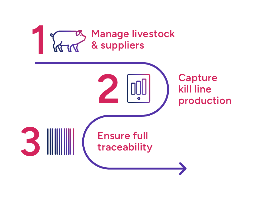 Animal identification is captured at arrival and follows each carcass through the kill line. Operators record grading, stunning and inspection data while the system automatically builds the regulatory record required for compliance.